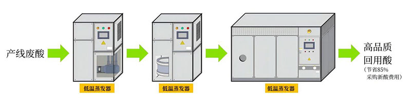 化抛废酸除铝技术是我司研发的离子高效分离技术,可实现酸和金属盐之间的有效分离。分离金属离子后的稀酸自动进入酸浓缩系统处理,通过内部负压系统、蒸馏釜、交换系统及设备自身热能系统的转换,对废酸液进行热交换,使原液在设定温度下汽化。蒸汽液化为蒸发出水,蒸发出水中总磷浓度较低,纳入水站进行后续处理。